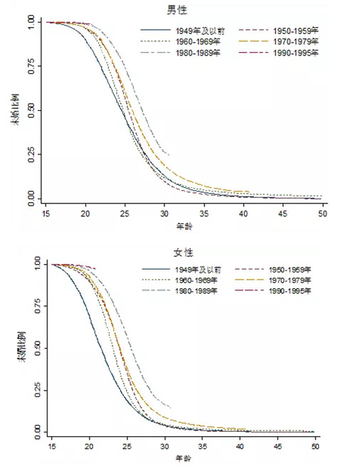 而且初婚年龄的中位数总体随着出生年份的推移呈现增加的趋势(图3):1949年及以前出生的女性的初婚年龄中位数在20-21岁之间,男性则在23-24岁之间。而在1980年以后出生的女性和男性中,初婚年龄中位数则分别上升到了23-24岁和25-26岁。由此可见,早婚与普婚这一传统特征已经发生很大变化。
