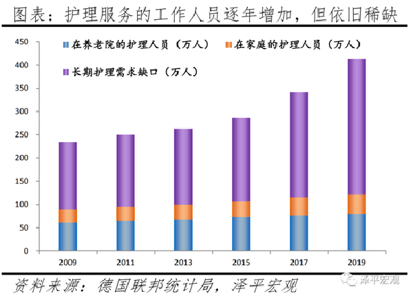 随着老龄化程度加深,德国依赖护理的老年人群尤其是婴儿潮一代需要护理的比例将显著增加,这对德国政府和私人护理机构来说是巨大的挑战。据德国联邦统计局数据,2019年12月,德国有413万人需要《长期护理保险法》所定义的长期护理,与2017年12月份需要长期护理的341万人相比,人数显著增加了71万人,上涨了21%。随着新的、更广泛的长期护理概念被人们所熟知,叠加老龄化加深,需要护理的人数会逐年增加。从参与护理的工作人员数看,德国2017年在养老院的护理员工为76.4万,在家庭护理中的护理员人数为39万,合计115.5万人,远低于当年需要护理服务的341万人。从居住地附近的康养设施、医疗机构分布看,2019年德国有大约67%需要护理的人生活在家庭环境中,并由亲戚或提供门诊护理服务的专业人员一起照顾。但根据柏林人口研究院统计,德国婴儿潮一代的76%以上的老人更希望更长时间的保持独立,并自由地在居住地附近活动,而不是单纯的在家中受到照顾。同时,35%的社区老人认为:在步行或承载交通工具短距离出行范围内,有完善的家庭医生、医疗用品商店的重要性就越来越高。尤其是在德国东部以及农村地区,医疗分支机构、保健中心的分布密度不足西部发达区域的60%,专业的护理人员短缺的现象也会随着老龄化加剧而越发严重。